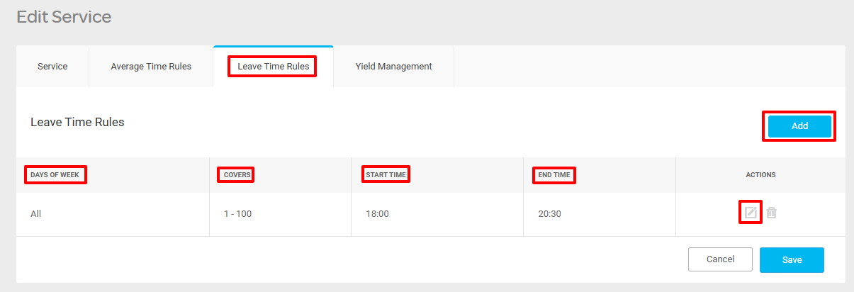 NOTE: You may have a generic leave time rule set up on your service tab also like below (which will apply to All party sizes/days of the week during this service - if no other Leave Time Rules are created to override this):