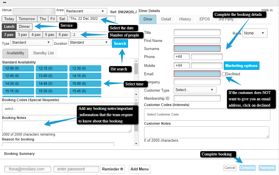 Fields in blue are required fields to complete the booking, these options may differ depending on your venue. Here you can add customer notes, such as dietary requirements, customer preferences, etc. These will display every time this diner books.