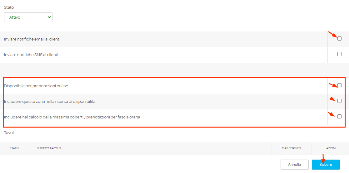 3. Se vuoi rendere la nuova Zona disponibile per prenotazioni online, clicca sul quadratino "Disponibile per prenotazioni online"