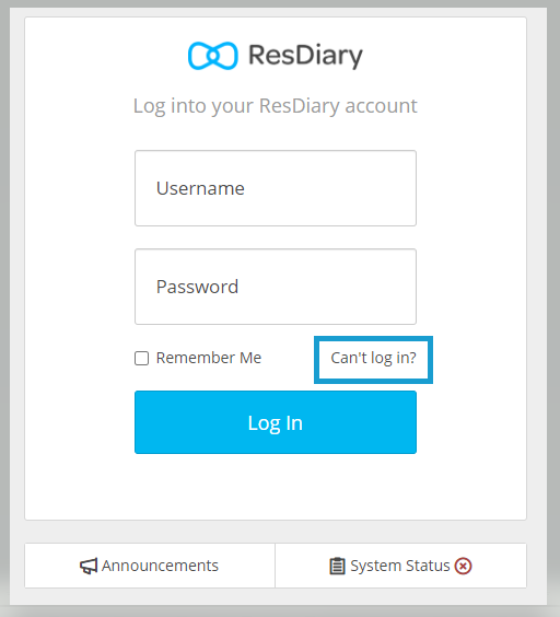 3. To change your password from the login page go to https://login.resdiary.com/ and press can't log in? Add your email address that's used for your username - confirm you are not a robot and press submit.