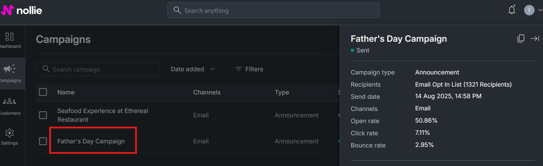 - This will open a pop up on the right side of the screen with the campaign statistics as well as a previous of the campaign sent.