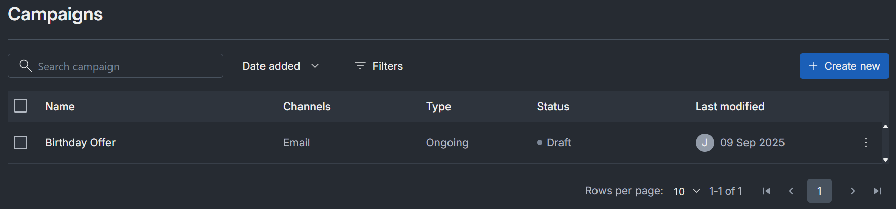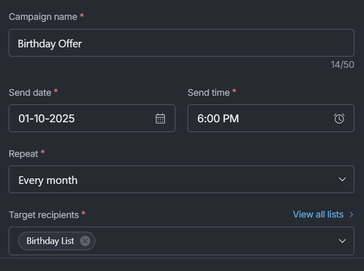 - Ongoing - Used for ongoing automated messages to specific static or dynamic customer lists. Example: Birthday offer message sent each month automatically to all customers with a birthday that month (in order to send this a dynamic birthday customer list would need to be created, See: Nollie | Customer Management)