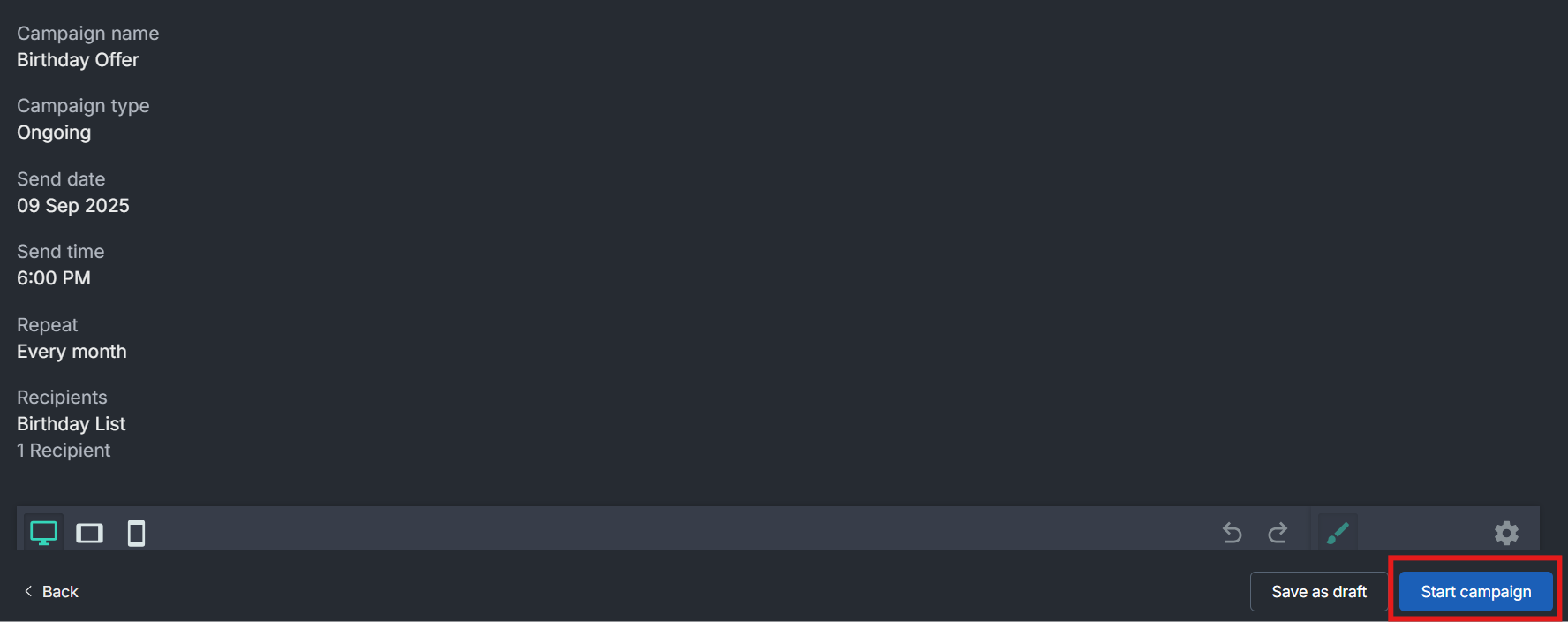 - This will then generate a summary of the campaign sending information and Start Campaign can be selected to send the campaign to your selected customer list.
