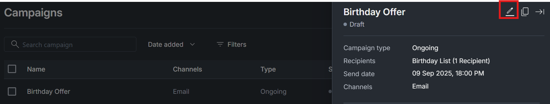 Click on the email you would like to edit and this will open a pop up on the right side of the screen with a preview of the email and option to edit your campaign ready to be sent out.