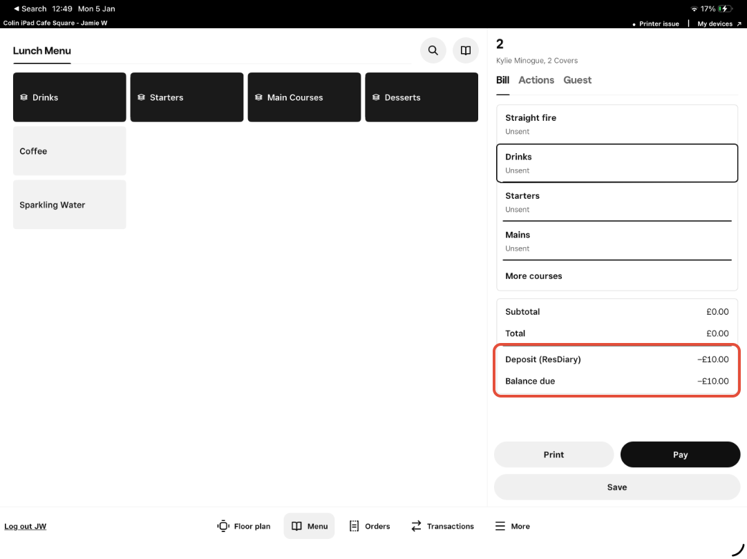 (Note: deposits will only be applied to the corresponding check in Square if the check is opened via ResDiary by updating the booking to Fully Seated)