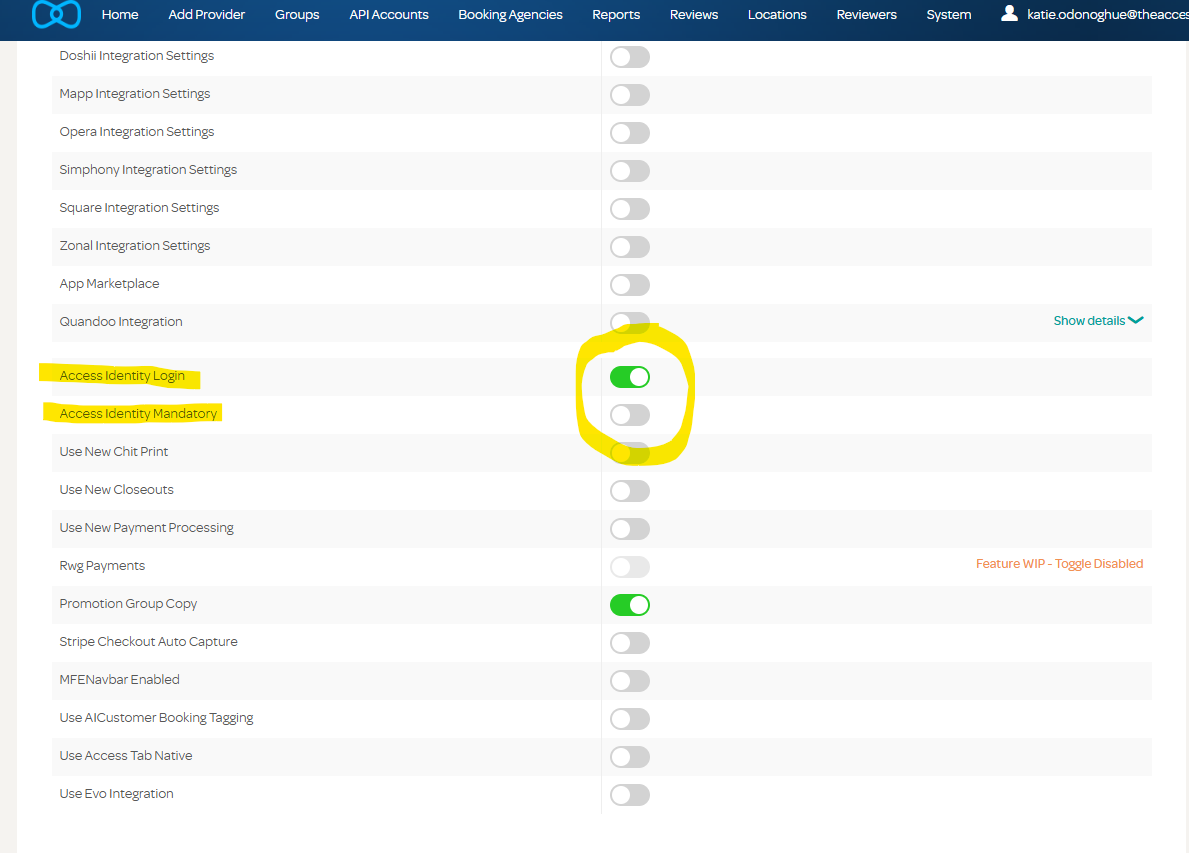 This can be done by going to the back office of the diary > features > switch off ONLY the mandatory Access Identity Mandatory toggle. (The toggle called Access Identity Login should remain ON!). See below: