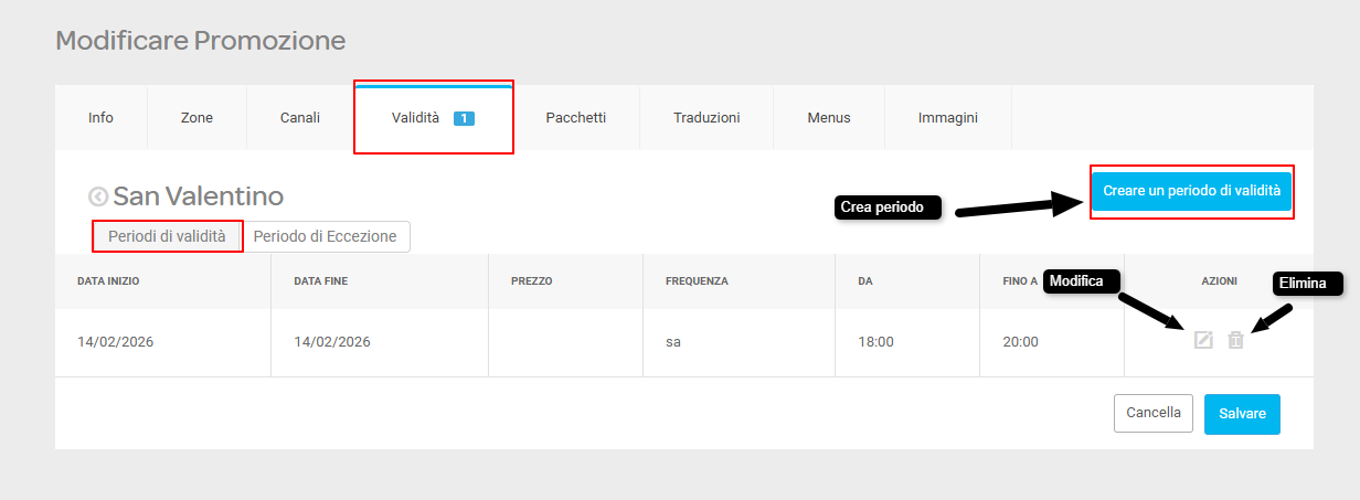 | Periodo di validità | La data e l'ora di quando la promozione é valida. | Voglio che la mia promozione di San Valentino sia prenotabile dal 14 Febbraio. |