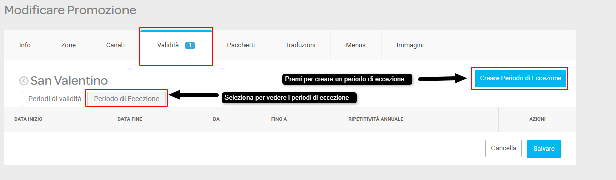 Per esempio, diciamo che avete una promozione ad Aprile, ma non volete che appaia per Pasqua, potete creare un periodo di eccezione per far si che non appaia.